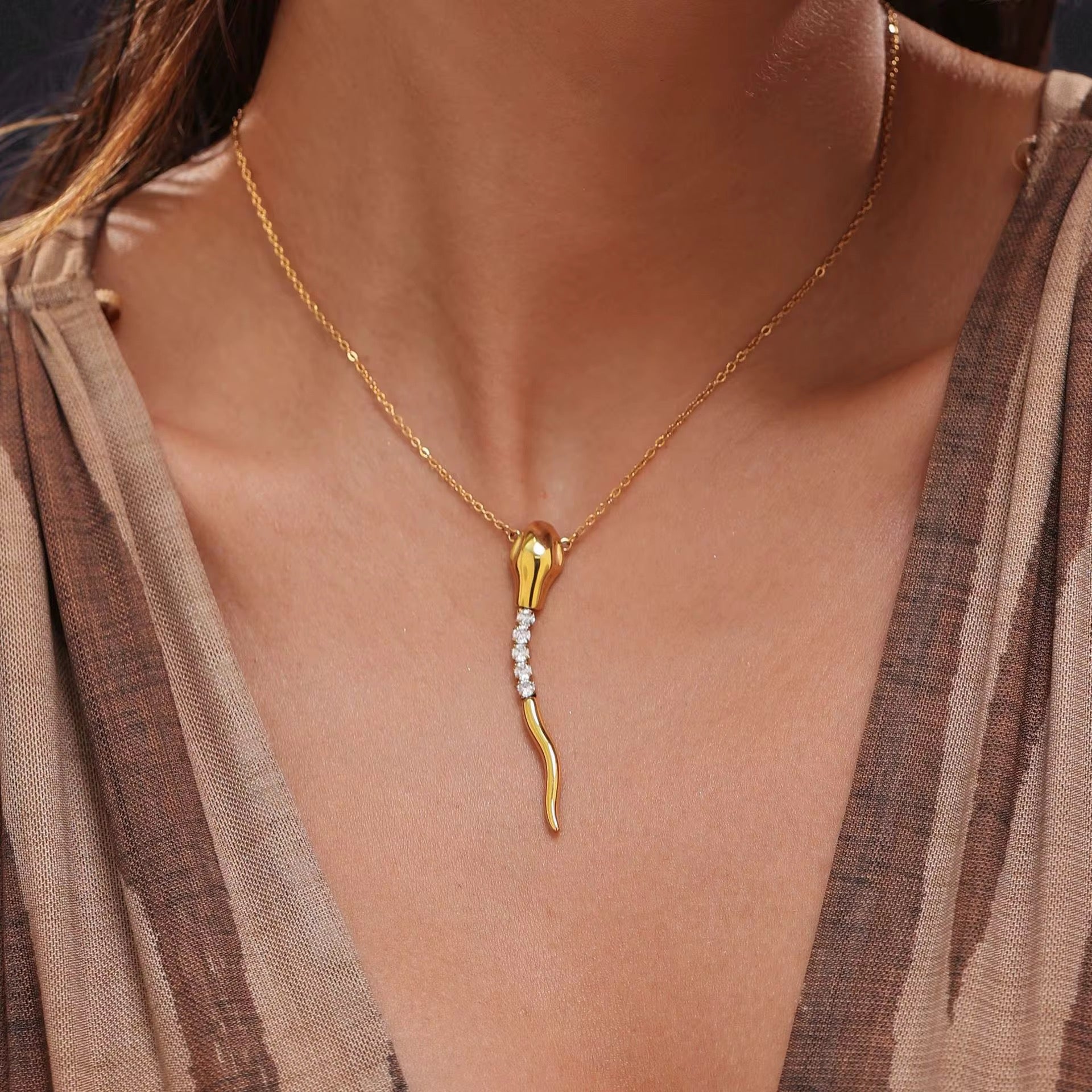 Viretta is a snake shaped cubic zirconia stone studded wavy necklace.